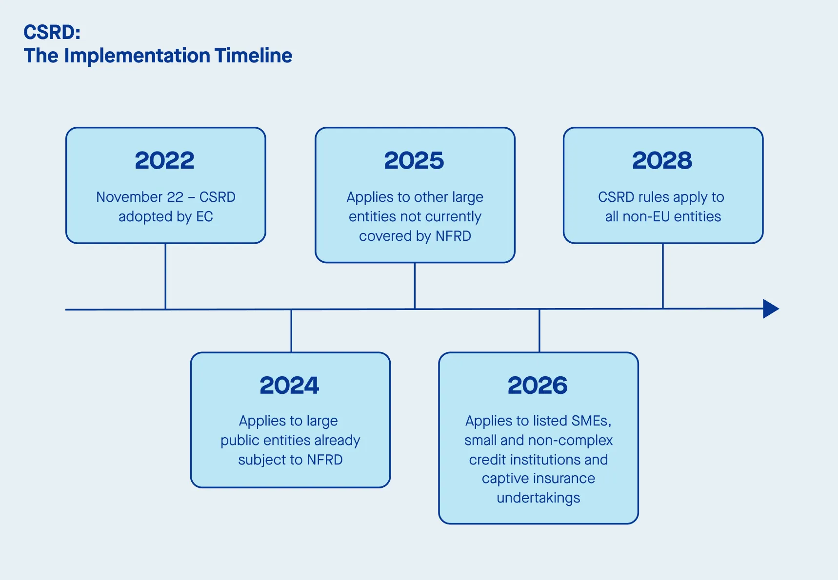 - 2024: Large companies already subject to the Non-Financial Reporting Directive (NFRD) must comply with CSRD requirements, with the first reports due in 2025.