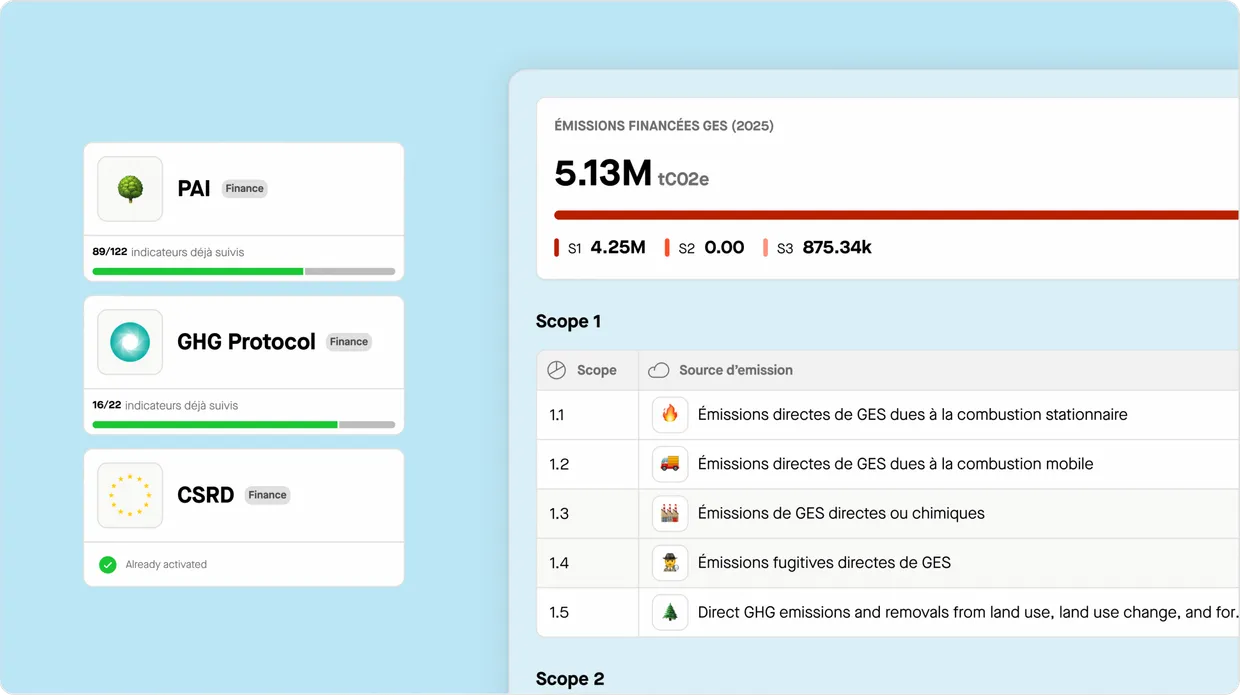 - Alignez votre reporting des émissions financées sur la méthodologie PCAF et le GHG Protocol