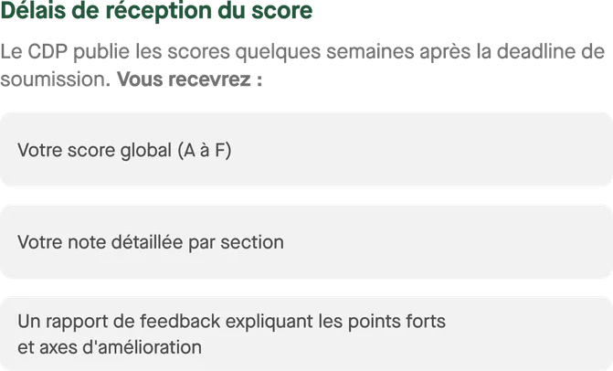 Les scores du CDP sont de plus en plus utilisés pour orienter les décisions d’investissement et d’approvisionnement. Obtenir un bon score est donc à la fois une preuve de votre engagement, mais aussi un moyen d’améliorer votre performance business.