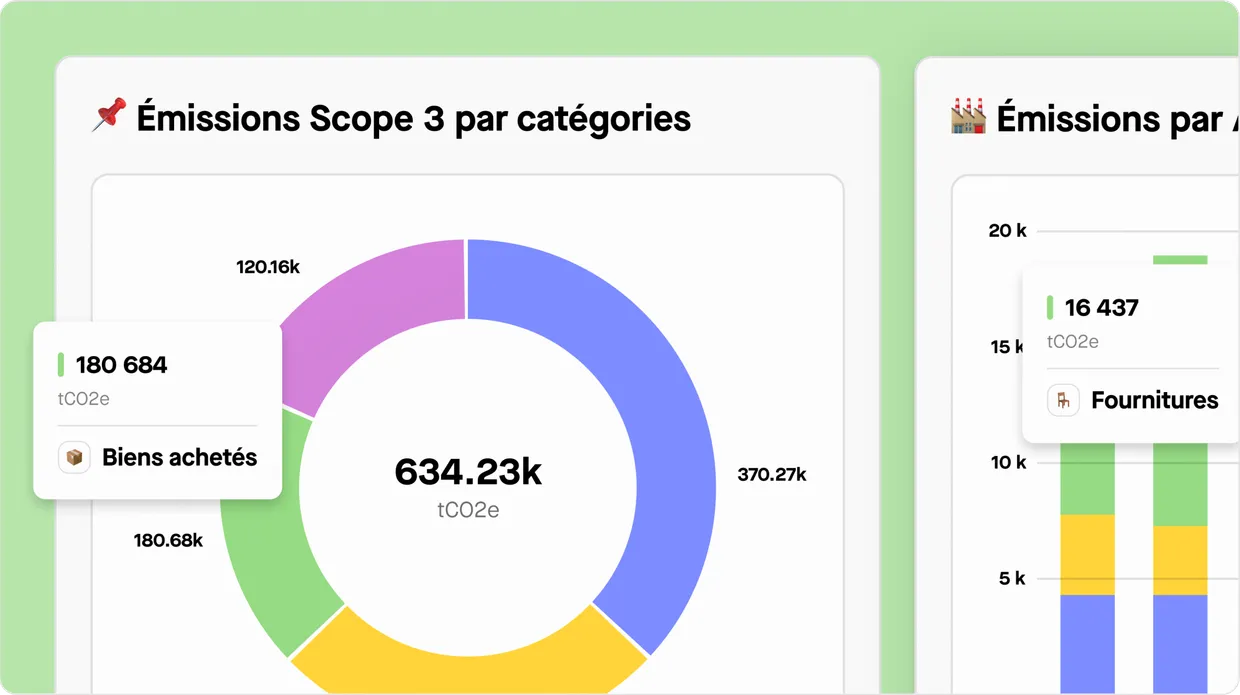- Suivez l’évolution de vos émissions Scope 3 grâce à des dashboards actualisés en temps réel.