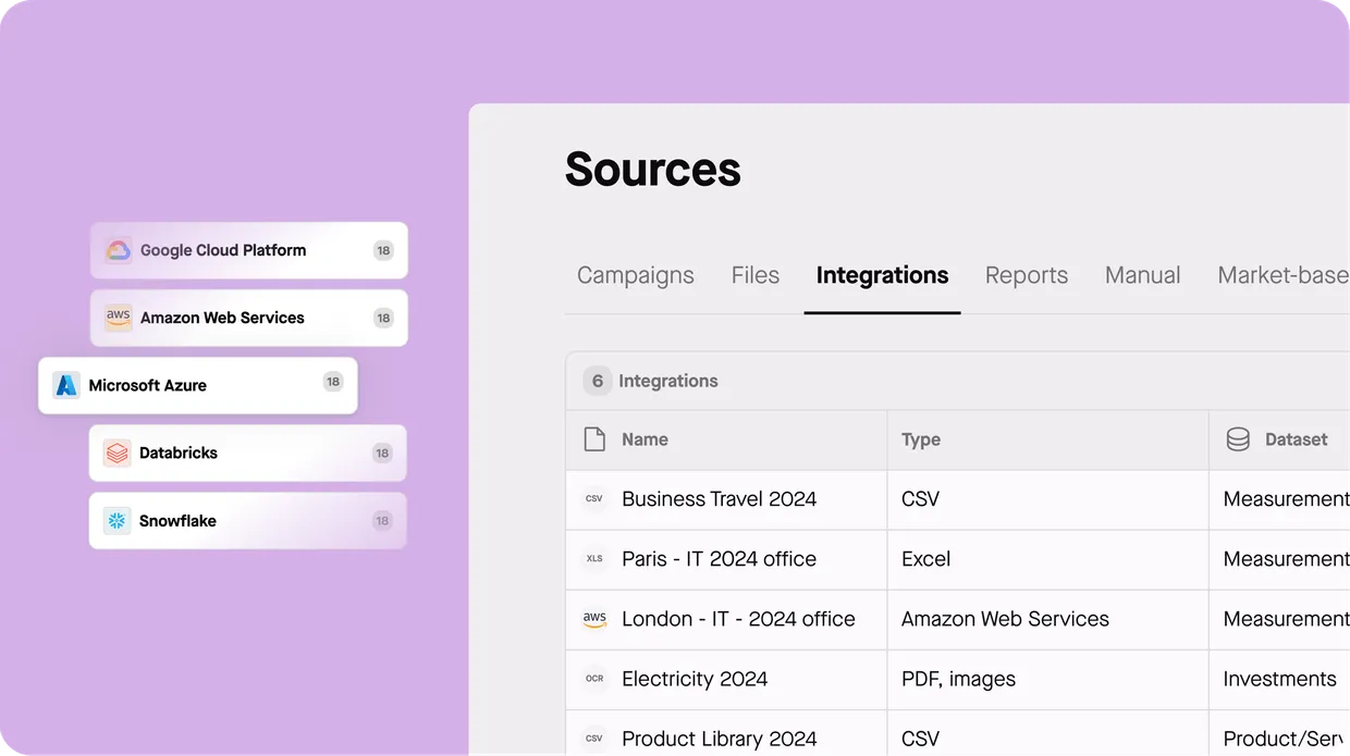 Sweep makes it easy to bring together emissions, ESG, and operational data from across your organisation, suppliers, and partners. Whether through built-in integrations, manual inputs, file uploads, or API connections, you can build a single, trusted source of truth.