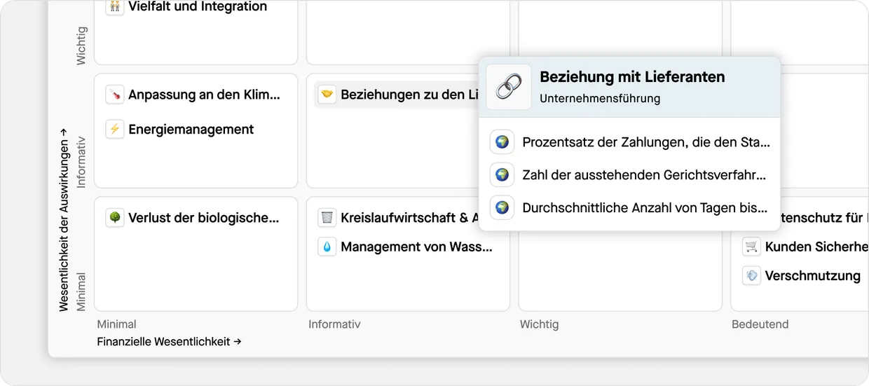 Führen Sie Ihre doppelte Wesentlichkeitsbewertung basierend auf Ihrer Branche durch. Verfeinern Sie Ihre finanziellen Auswirkungen und Wesentlichkeitsgrenzen, indem Sie sich auf kritische Nachhaltigkeitsthemen konzentrieren.