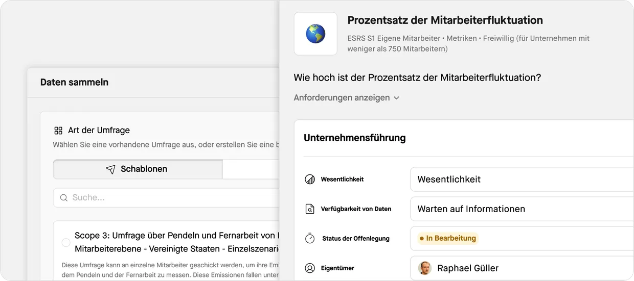 Überprüfen Sie die Datenverfügbarkeit und mögliche Lücken und optimieren Sie die Einbindung von Stakeholdern mit Umfragen und dem Importieren von Dateien. Verbessern Sie die Governance, indem Sie klare Rollen und Verantwortlichkeiten definieren.