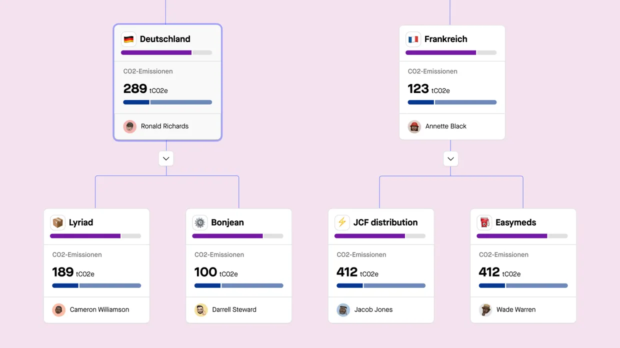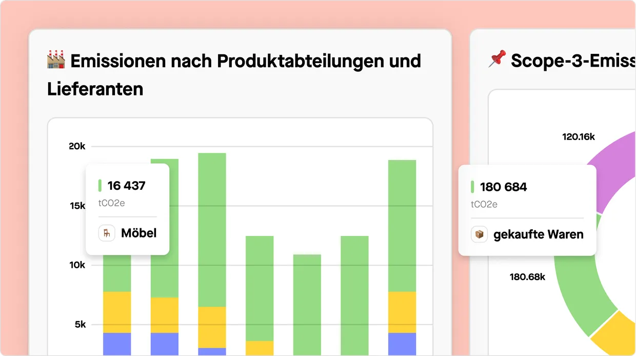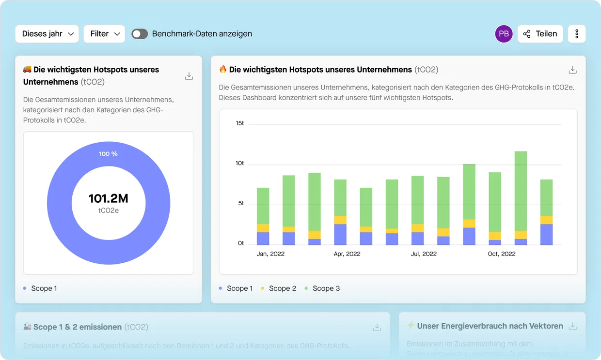 einen klaren Überblick über Ihre Kohlenstoff-Hotspots, zeigt verbesserungswürdige Bereiche auf und gibt KI-gesteuerte Empfehlungen zur Entscheidungsfindung. Sie können Reduktionspfade simulieren, um die Auswirkungen Ihrer Aktivitäten auf Ihren CO2-Fußabdruck zu prognostizieren.